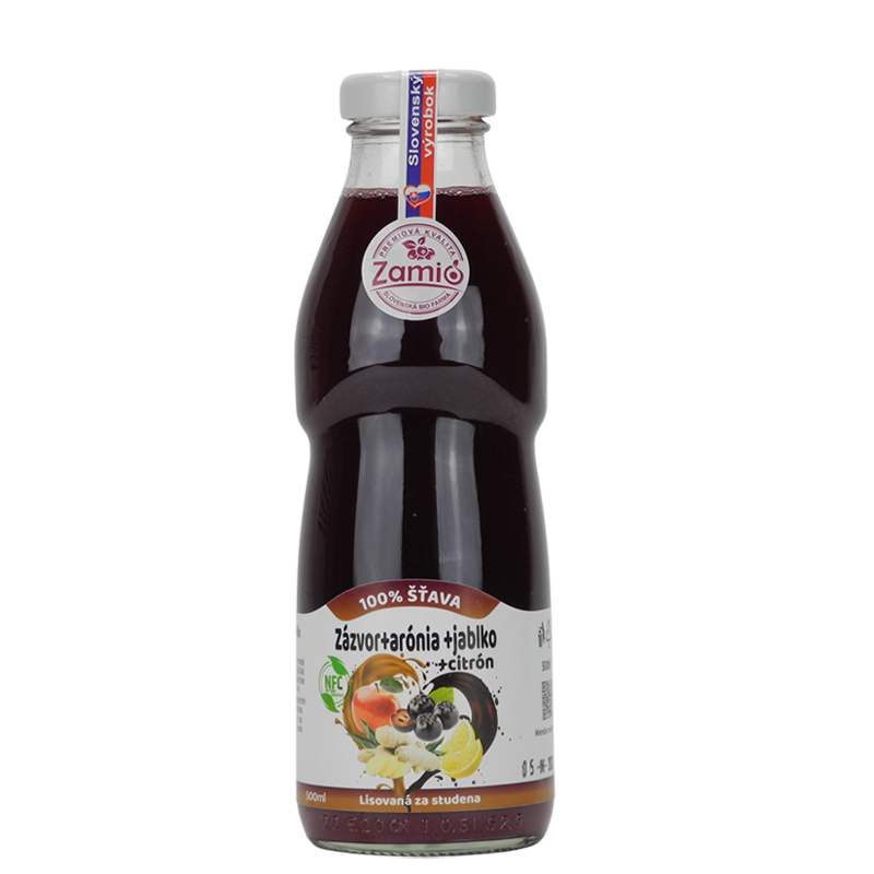 Zloženie: 100% šťava z prvého priameho lisovania z plodov BIO arónie čiernoplodej (Aronia melanocarpa lat.). 40%, 100% šťava z prvého priameho lisovania z BIO jabĺk (Malus domestica lat.) 39%, 100% šťava z prvého priameho lisovania zo zázvoru (Zingiber officinale lat.) 15%, 100% šťava z prvého priameho lisovania z citrónov (Citrus limon lat.) 6%.